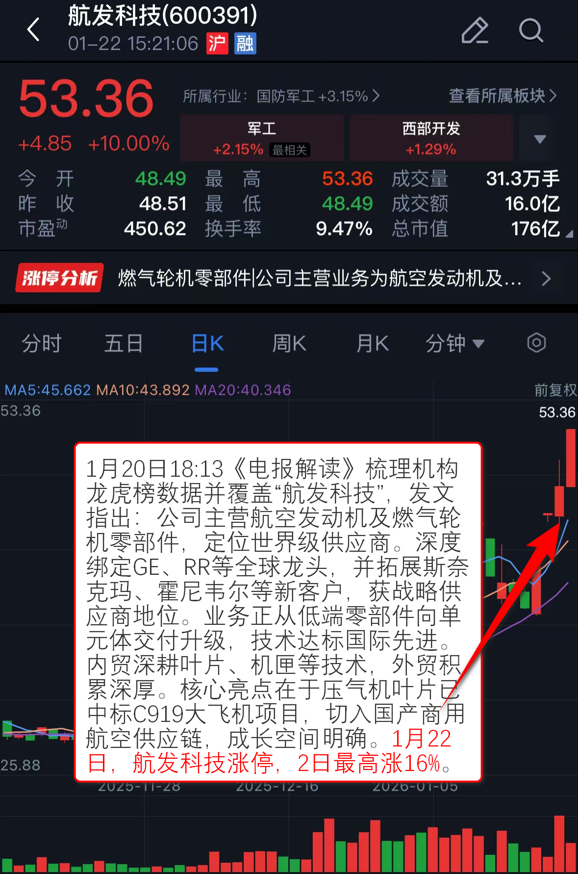 1月20日18:13《电报解读》梳理机构龙虎榜数据并覆盖“航发科技”,发文指出:公司主营航空发动机及燃气轮机零部件,定位世界级供应商。深度绑定GE、RR等全球龙头,并拓展斯奈克玛、霍尼韦尔等新客户,获战略供应商地位。业务正从低端零部件向单元体交付升级,技术达标国际先进。内贸深耕叶片、机匣等技术,外贸积累深厚。核心亮点在于压气机叶片已中标C919大飞机项目,切入国产商用航空供应链,成长空间明确。1月22日,航发科技涨停,2日最高涨16%。