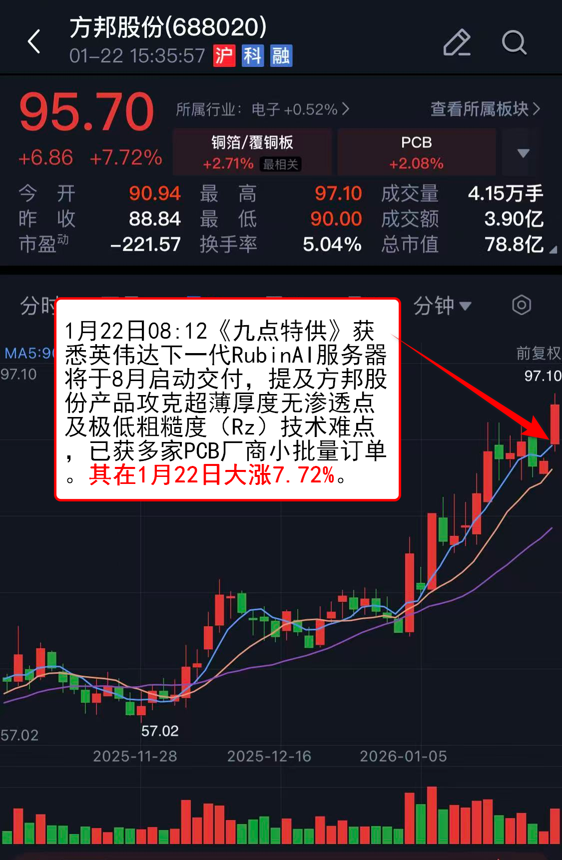 1月22日08:12《九点特供》获悉英伟达下一代RubinAI服务器将于8月启动交付,提及方邦股份产品攻克超薄厚度无渗透点及极低粗糙度(Rz)技术难点,已获多家PCB厂商小批量订单。其在1月22日大涨7.72%