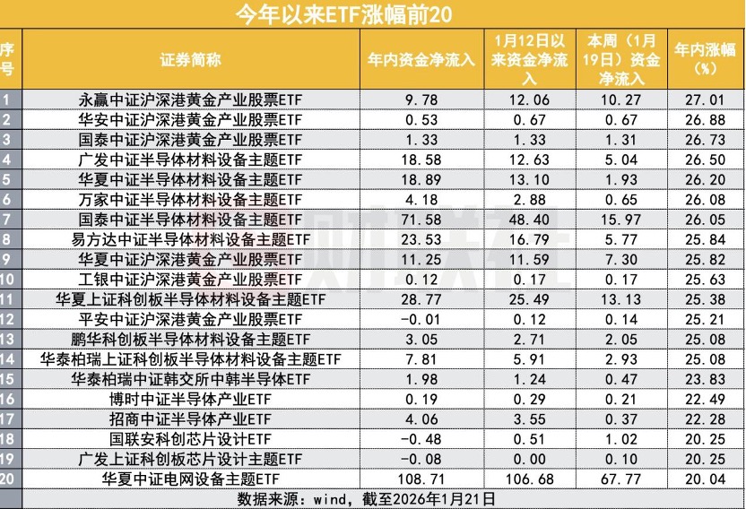 Wind数据显示,截至1月21日,全市场ETF规模回落至6万亿元以下,但结构性行情仍在,有色金属、电网设备、软件服务、商用卫星、AI应用、化工等领域获得资金持续买入。