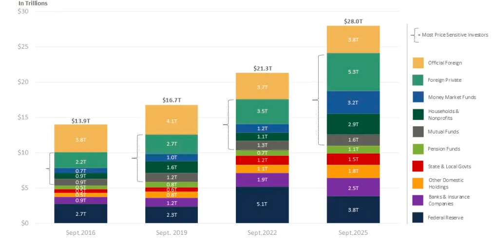 对冲基金巨头瑞·达利欧近来也已持续警示美国债务货币化风险,本周他在瑞士达沃斯论坛期间亦重申了此观点。在谈及美国经济时,达利欧长期直言不讳地批评国家债务激增问题。他表示,当前危机已严重到面临“货币秩序崩溃”的地步,并提出严峻抉择:“是印钞还是放任债务危机爆发?”