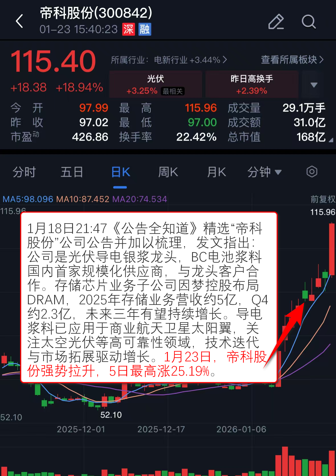 1月18日21:47《公告全知道》精选“帝科股份”公司公告并加以梳理,发文指出:公司是光伏导电银浆龙头,BC电池浆料国内首家规模化供应商,与龙头客户合作。存储芯片业务子公司因梦控股布局DRAM,2025年存储业务营收约5亿,Q4约2.3亿,未来三年有望持续增长。导电浆料已应用于商业航天卫星太阳翼,关注太空光伏等高可靠性领域,技术迭代与市场拓展驱动增长。1月23日,帝科股份强势拉升,5日最高涨25.19%。