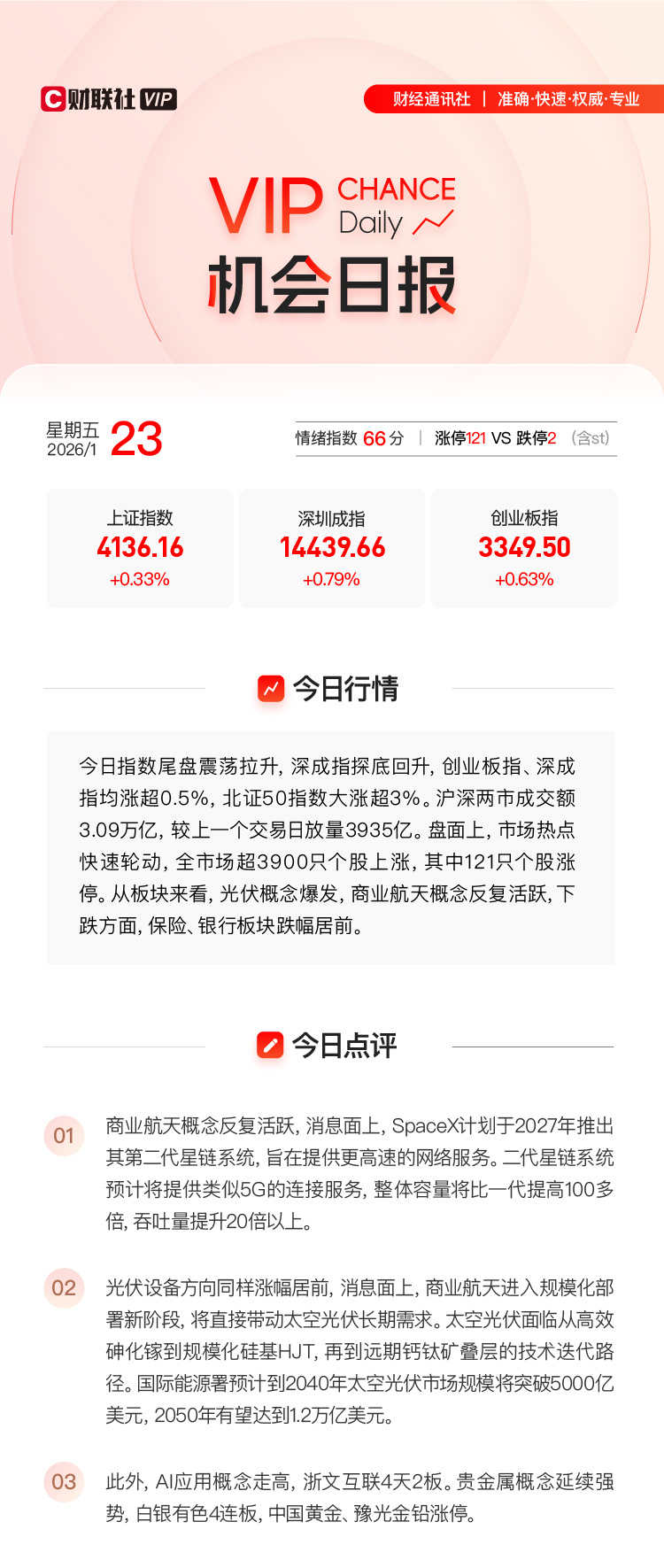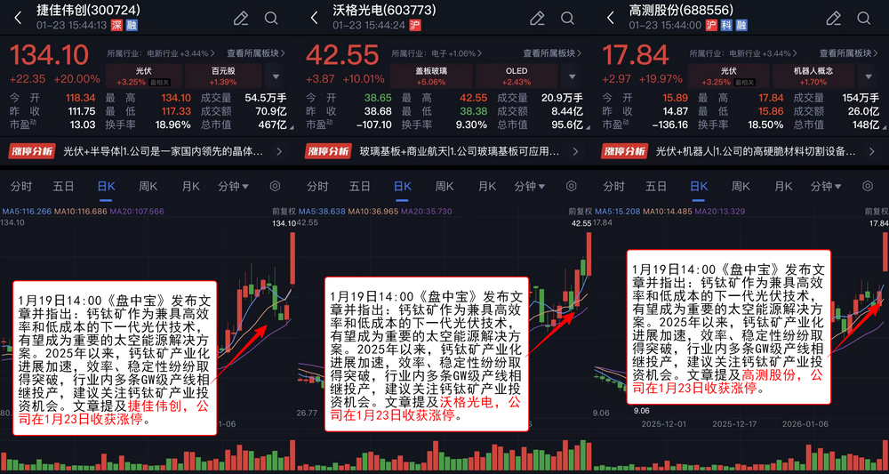 1月19日14:00《盘中宝》发布文章并指出:钙钛矿作为兼具高效率和低成本的下一代光伏技术,有望成为重要的太空能源解决方案。2025年以来,钙钛矿产业化进展加速,效率、稳定性纷纷取得突破,行业内多条GW级产线相继投产,建议关注钙钛矿产业投资机会。文章提及捷佳伟创、沃格光电、高测股份,三家公司均在1月23日集体收获涨停。