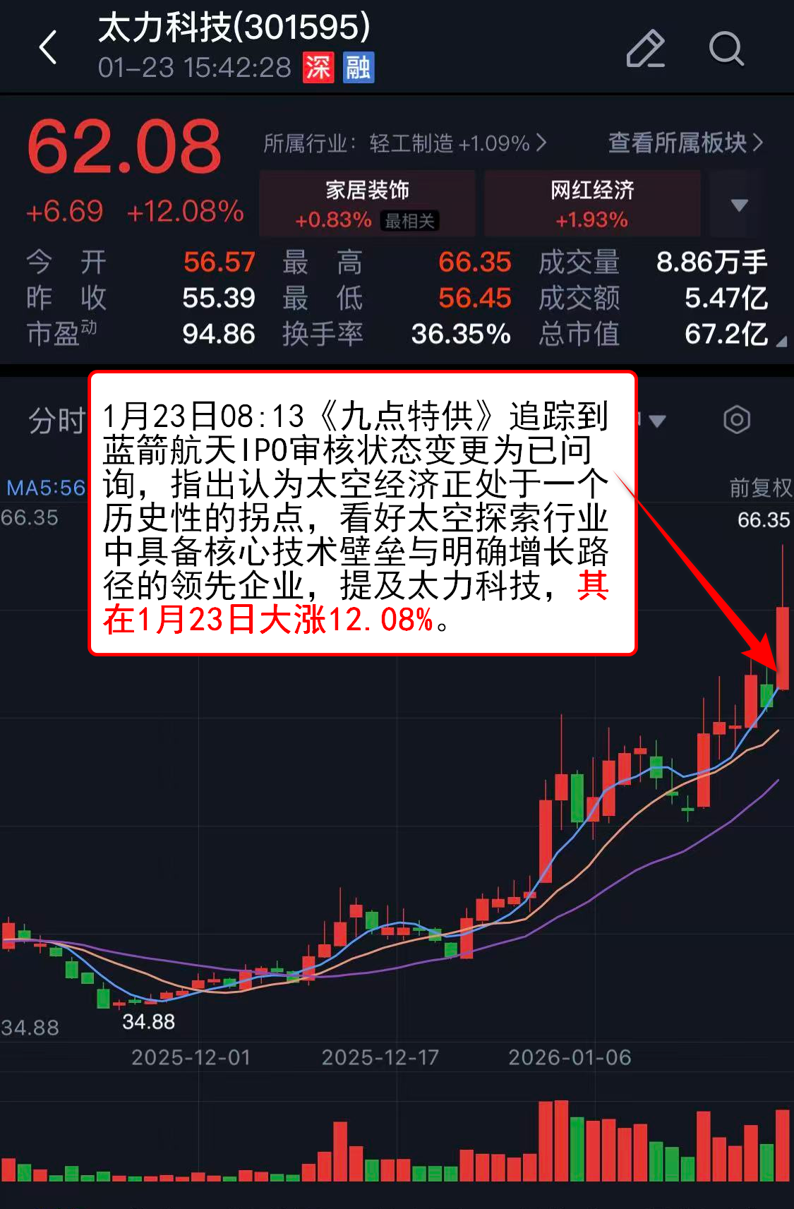 1月23日08:13《九点特供》追踪到蓝箭航天IPO审核状态变更为已问询,指出认为太空经济正处于一个历史性的拐点,看好太空探索行业中具备核心技术壁垒与明确增长路径的领先企业,提及太力科技,其在1月23日大涨12.08%。