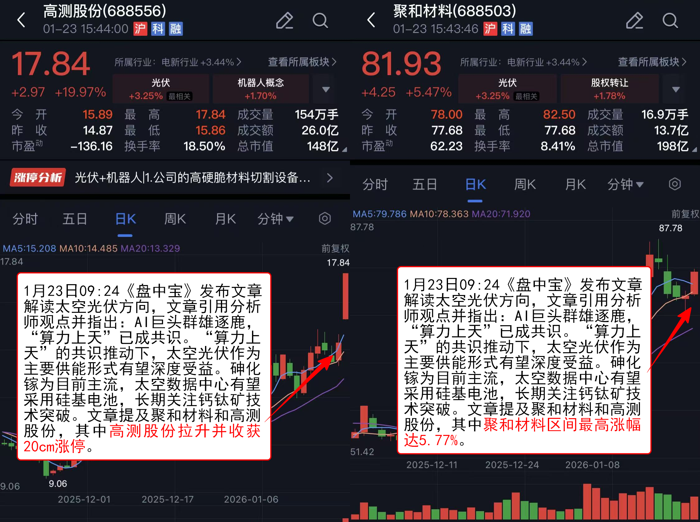 1月23日09:24《盘中宝》发布文章解读太空光伏方向,文章引用分析师观点并指出:AI巨头群雄逐鹿,“算力上天”已成共识。“算力上天”的共识推动下,太空光伏作为主要供能形式有望深度受益。砷化镓为目前主流,太空数据中心有望采用硅基电池,长期关注钙钛矿技术突破。文章提及聚和材料和高测股份,其中高测股份拉升并收获20cm涨停,聚和材料区间最高涨幅达5.77%。