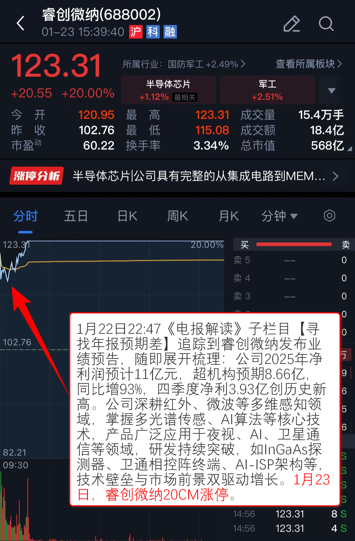 1月22日22:47《电报解读》子栏目【寻找年报预期差】追踪到睿创微纳发布业绩预告,随即展开梳理:公司2025年净利润预计11亿元,超机构预期8.66亿,同比增93%,四季度净利3.93亿创历史新高。公司深耕红外、微波等多维感知领域,掌握多光谱传感、AI算法等核心技术,产品广泛应用于夜视、AI、卫星通信等领域,研发持续突破,如InGaAs探测器、卫通相控阵终端、AI-ISP架构等,技术壁垒与市场前景双驱动增长。1月23日,睿创微纳20CM涨停。