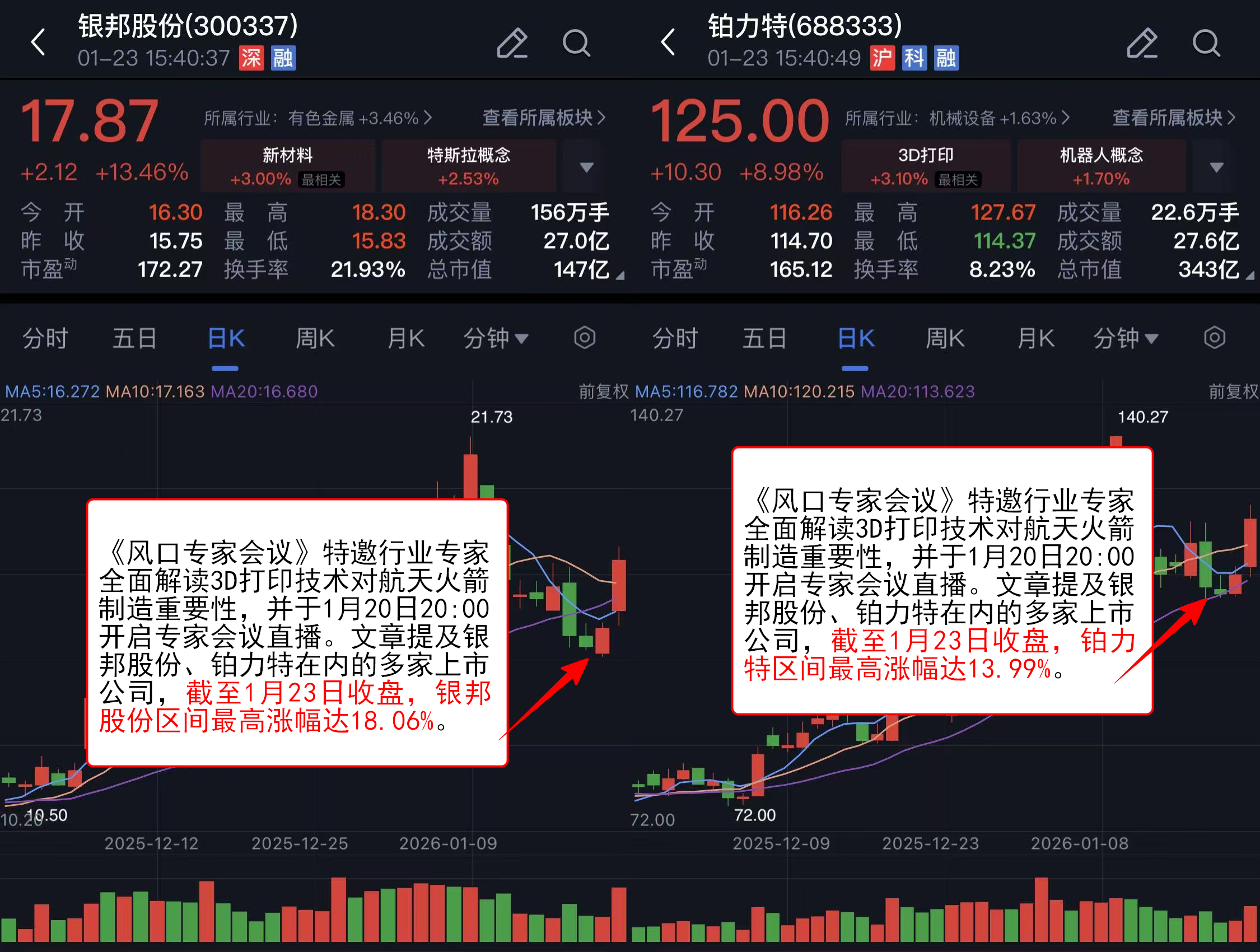 《风口专家会议》特邀行业专家全面解读3D打印技术对航天火箭制造重要性,并于1月20日20:00开启专家会议直播。文章提及银邦股份、铂力特在内的多家上市公司,截至1月23日收盘,银邦股份区间最高涨幅达18.06%,铂力特区间最高涨幅达13.99%。