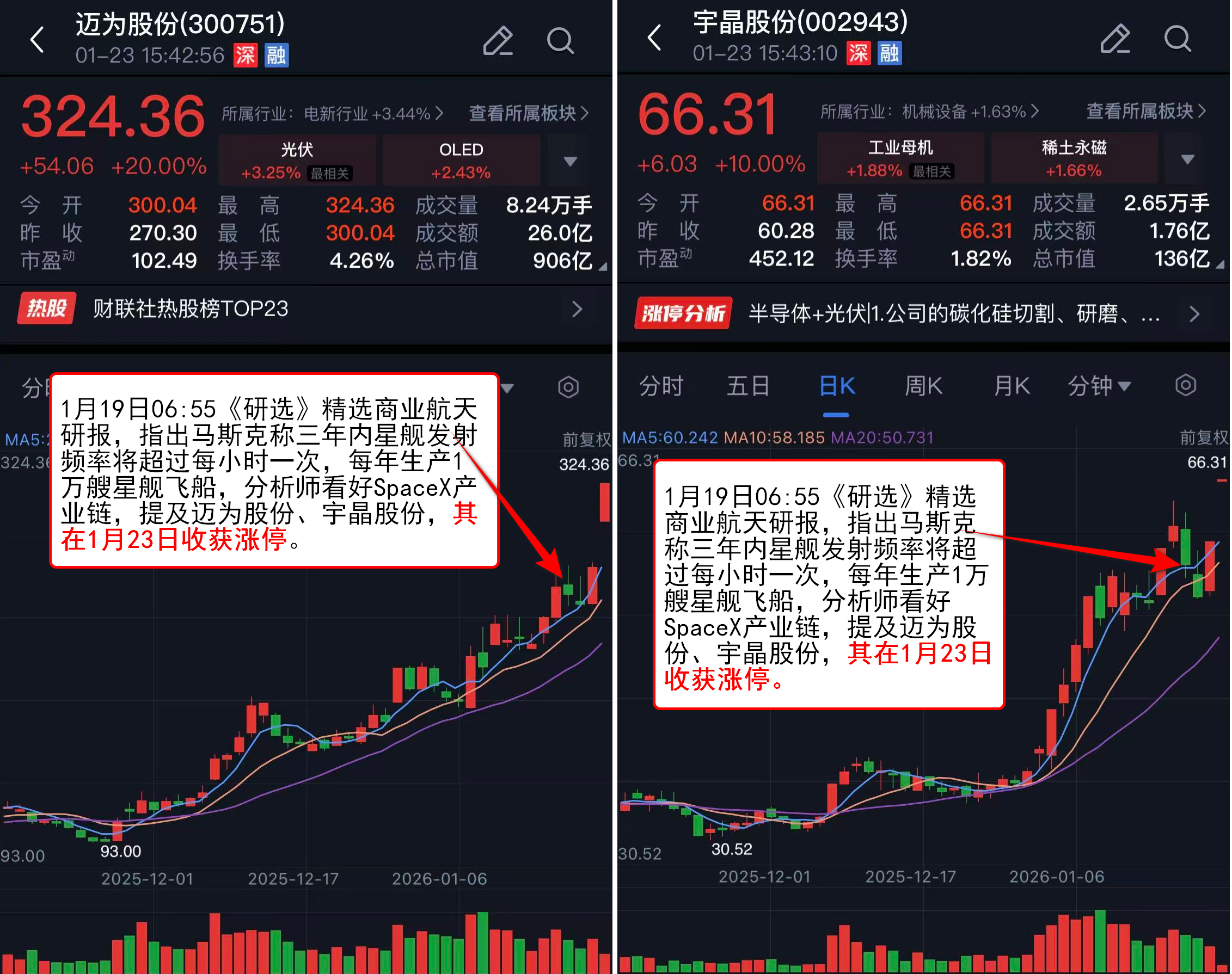1月19日06:55《研选》精选商业航天研报,指出马斯克称三年内星舰发射频率将超过每小时一次,每年生产1万艘星舰飞船,分析师看好SpaceX产业链,提及迈为股份、宇晶股份,其在1月23日收获涨停。