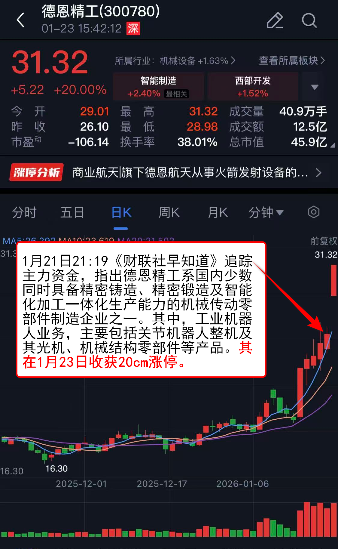 1月21日21:19《财联社早知道》追踪主力资金动向,指出德恩精工系国内少数同时具备精密铸造、精密锻造及智能化加工一体化生产能力的机械传动零部件制造企业之一。其中,工业机器人业务,主要包括关节机器人整机及其光机、机械结构零部件等产品。其在1月23日收获20cm涨停。