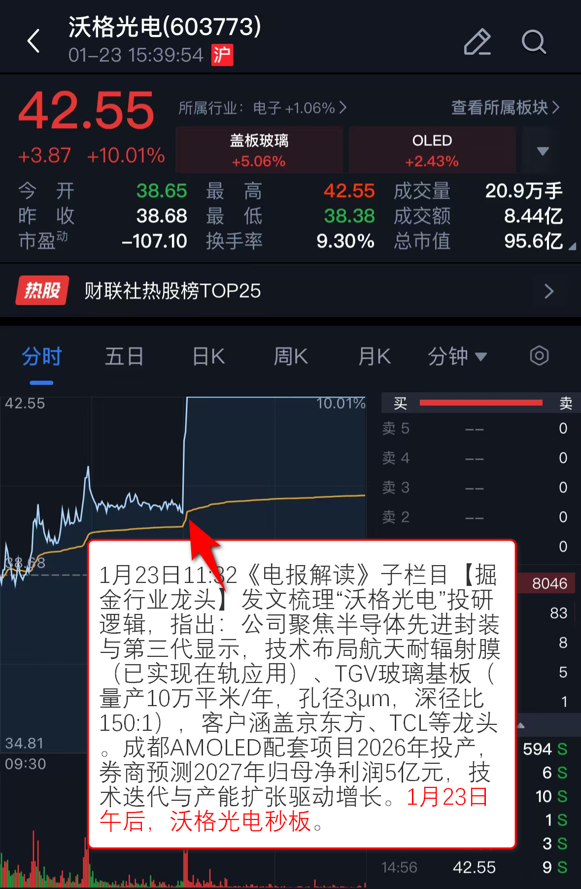 1月23日11:32《电报解读》子栏目【掘金行业龙头】发文梳理“沃格光电”投研逻辑,指出:公司聚焦半导体先进封装与第三代显示,技术布局航天耐辐射膜(已实现在轨应用)、TGV玻璃基板(量产10万平米/年,孔径3μm,深径比150:1),客户涵盖京东方、TCL等龙头。成都AMOLED配套项目2026年投产,券商预测2027年归母净利润5亿元,技术迭代与产能扩张驱动增长。1月23日午后,沃格光电秒板。