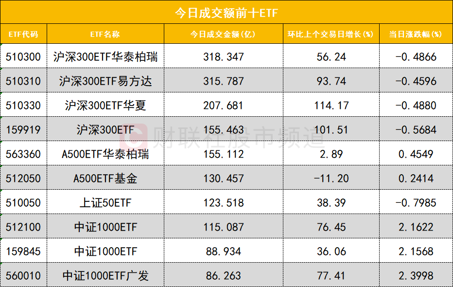 从成交额前十的ETF来看,沪深300ETF华泰柏瑞(510300)成交额位居首位,沪深300ETF易方达(510310)成交额位居次席。