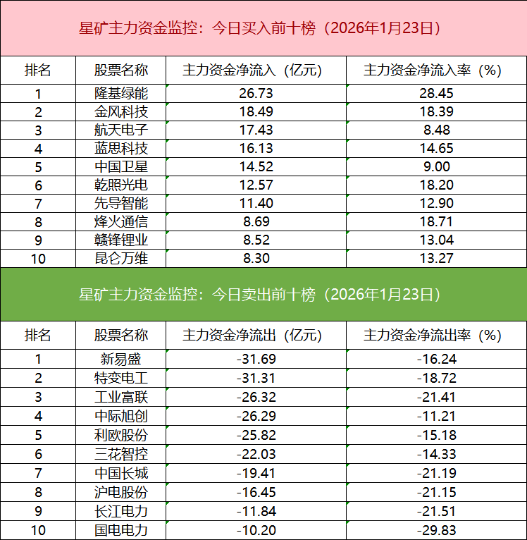 从个股主力资金监控数据来看,主力资金净流入前十的个股所属板块以商业航天和太空光伏为主,隆基绿能净流入居首。