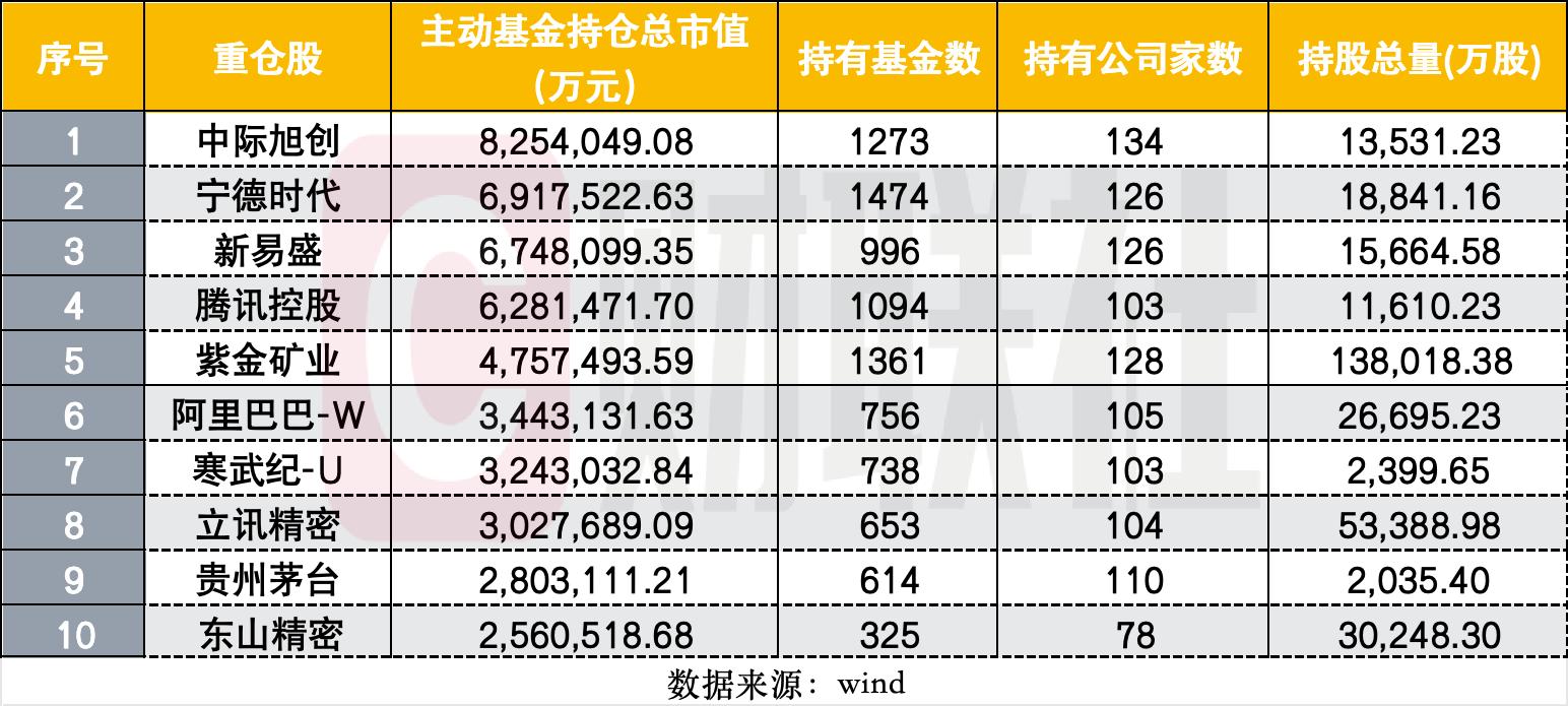①宁德时代稳居公募全市场重仓榜首,中际旭创快速逼近且成为主动基金头号重仓股;