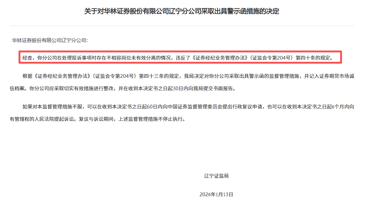 1月23日,辽宁证监局、浙江证监局相继披露罚单,华林证券辽宁分公司,浙商证券杭州分公司及时任管理人员林长富、应文敏被采取出具警示函措施。其中,华林证券辽宁分公司涉不相容岗位未有效分离违规,浙商证券杭州分公司则存在账户实名制管理不到位等问题。
