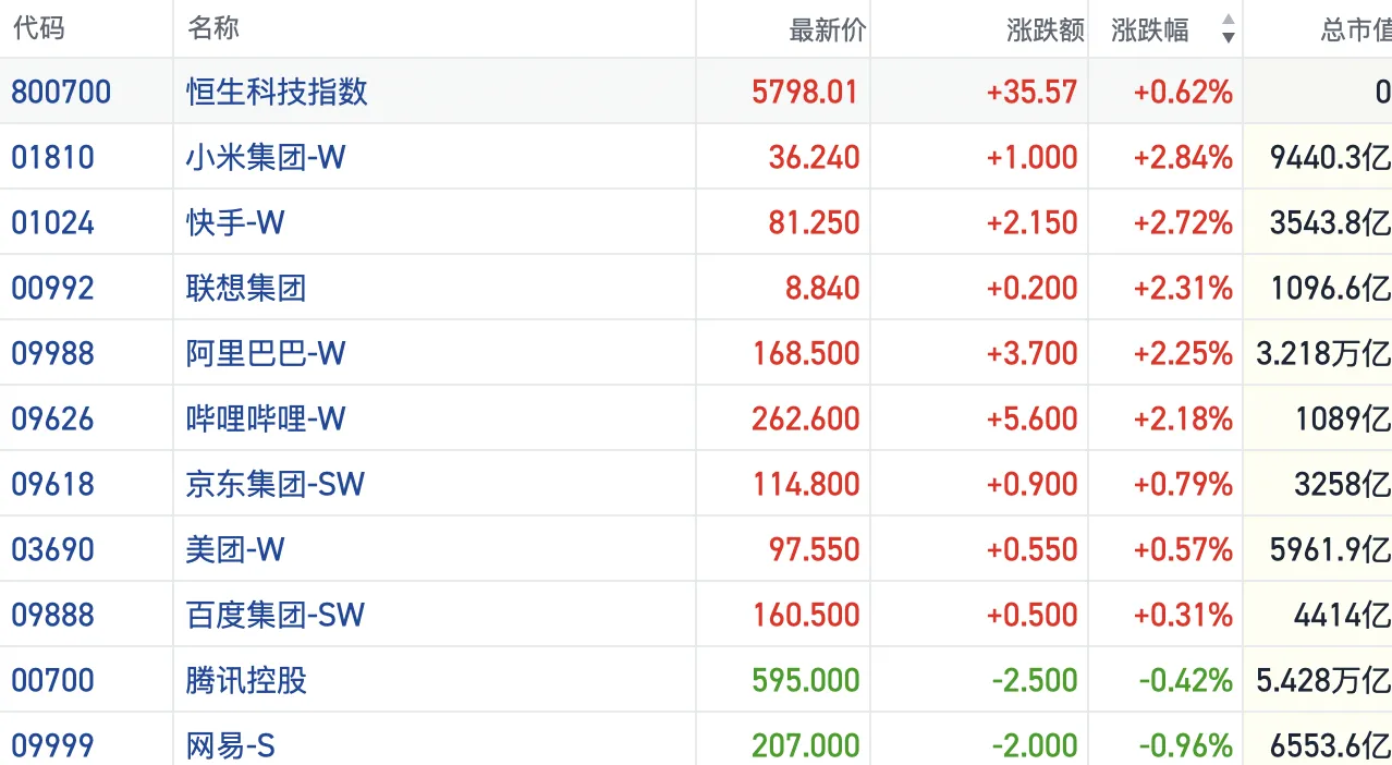盘面上,今日大型科网股继续活跃,小米反弹涨近3%,阿里巴巴涨超2%,京东、美团均有涨幅。