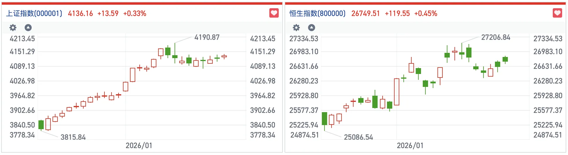 财联社1月23日讯(编辑 冯轶)今日港股三大指数集体收涨。截至收盘,恒生指数涨0.45%报26749点,国企指数涨0.51%,恒生科技指数涨0.62%。