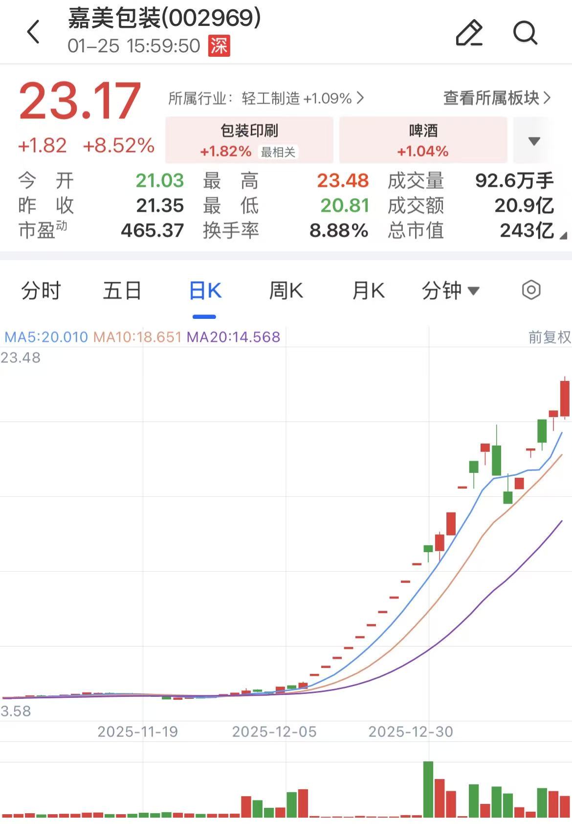 嘉美包装周五收涨8.52%,股价报23.17元再创新高,当前总市值为243亿元。值得一提的是,这也是嘉美包装月内第二次停牌核查,1月6日晚间,公司曾宣布进行停牌核查,复牌后股价仍延续震荡上涨态势。