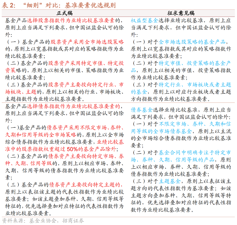 这是新规中较为瞩目的变化之一。在基准要素的优选规则上,正式稿将视角深化到基金底层资产,为同一只基金的不同底层大类资产给出了针对性的要求。招商证券基金评价中心指出,当前国内绝大多数公募基金无论是实际持仓还是现有基准设置均覆盖多个大类资产,因此正式稿中针对底层资产的差异化基准要素选取规范更加契合国内公募基金的发展现状。