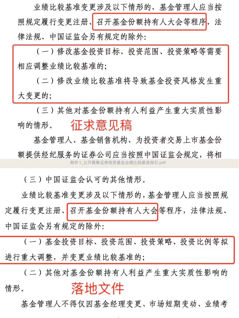 这意味着除此之外,仅对基金业绩比较基准变更,无需召开持有人大会。