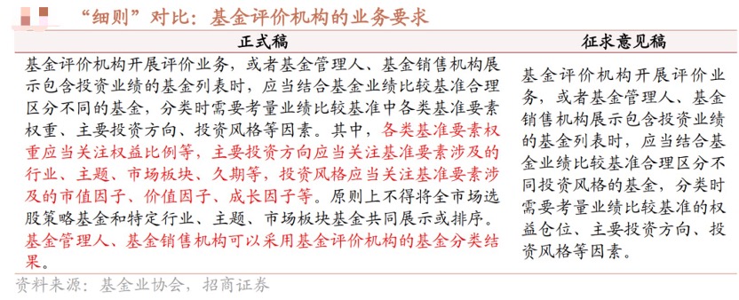 对基金评价机构的业务要求更加细化,也压实了基金评价机构的责任。比如,增加了各类基准要素权重、主要投资方向以及投资风格应该关注的要点。此外,新规指出基金管理人、基金销售机构可以采用基金评价机构的基金分类结果。