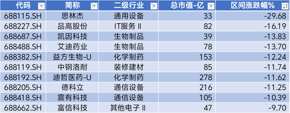 上表是本周跌幅榜前十公司,分别为:思林杰、品高股份、凯因科技、艾迪药业、益方生物-U、中钢洛耐、迪哲医药-U、德科立、震有科技、富信科技。