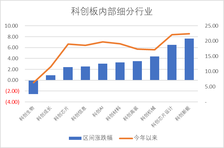 如上图所示,本周科创板内部呈现大部分上涨,其中新能源板块居前,生物医药板块居末。