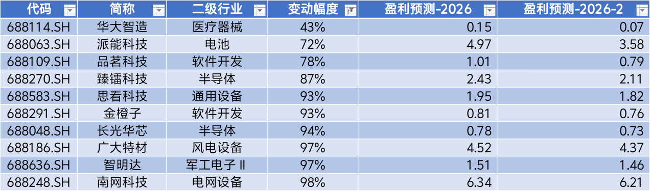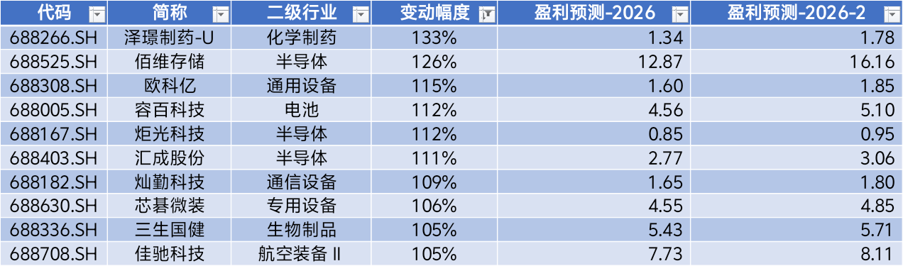 上表是本周盈利预测(规模净利润预测值)中值上调/下移的公司,其中上调有22家,本文选取其中幅度最大的前十家(若不足十家则按实际数量列示),分别为:泽璟制药-U、佰维存储、欧科亿、容百科技、炬光科技、汇成股份、灿勤科技、芯碁微装、三生国健、佳驰科技。