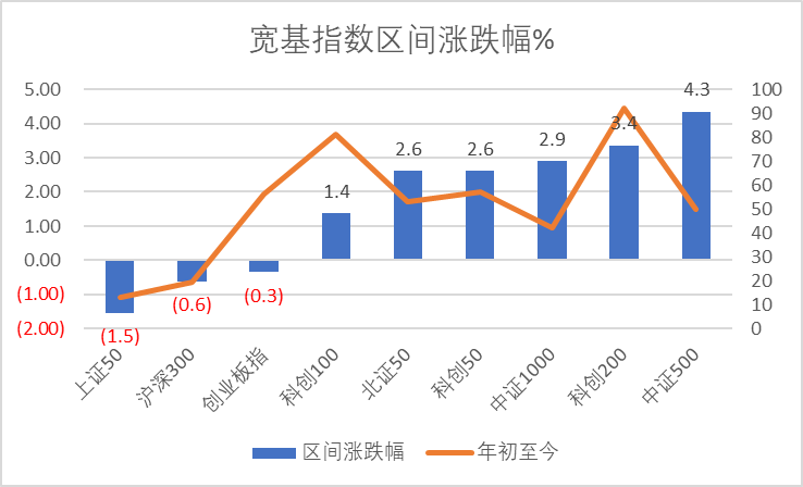 如上图,本周A股主要宽基指数呈现大部分上涨,科创系指数大多为正收益,其中科创200、科创50、科创100分别涨3.4%、2.6%、1.4%。