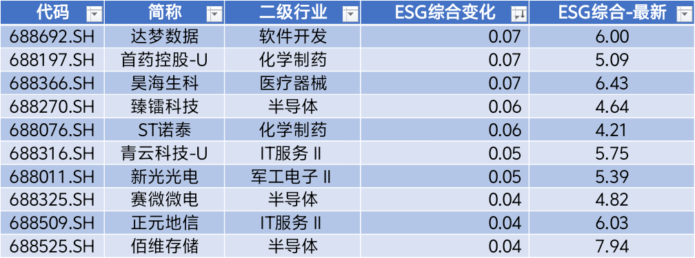 上表是ESG评分变化上升的前十家公司(剔除新上市公司),分别为:达梦数据、首药控股-U、昊海生科、臻镭科技、ST诺泰、青云科技-U、新光光电、赛微微电、正元地信、佰维存储。