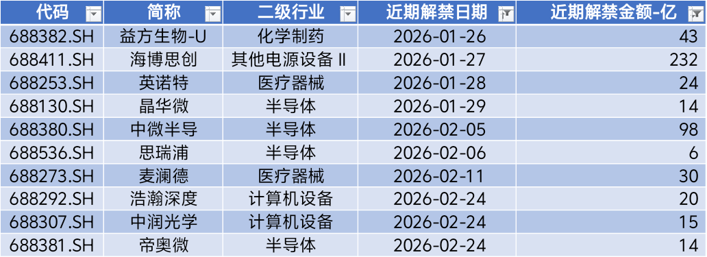经过wind数据终端查询,近期有解禁的公司,本文剔除金额小于5亿的部分,然后按照时间顺序由近至远,选取前10家公司,分别为:益方生物-U、海博思创、英诺特、晶华微、中微半导、思瑞浦、麦澜德、浩瀚深度、中润光学、帝奥微。