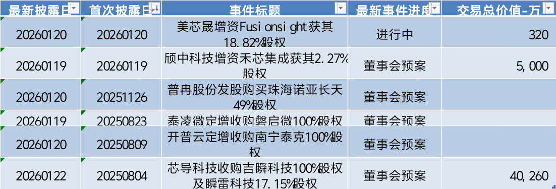 本周科创板并购最新进展共6条:美芯晟增资Fusionsight获其18.82%股权、颀中科技增资禾芯集成获其2.27%股权、普冉股份发股购买珠海诺亚长天49%股权、泰凌微定增收购磐启微100%股权、开普云定增收购南宁泰克100%股权、芯导科技收购吉瞬科技100%股权及瞬雷科技17.15%股权。其中,前两条属于本周首次披露。