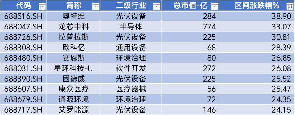 上表是本周涨幅榜前十公司,排名前十的公司分别是:奥特维、龙芯中科、拉普拉斯、欧科亿、赛恩斯、星环科技-U、固德威、康众医疗、通源环境、艾罗能源。