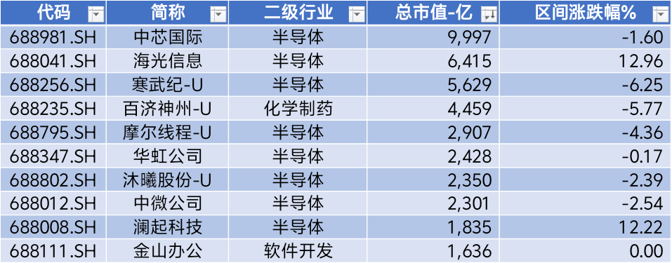 上图是本周科创板前十大权重公司呈现分化,海光信息涨近13%居前,寒武纪-U跌6.3%居末。