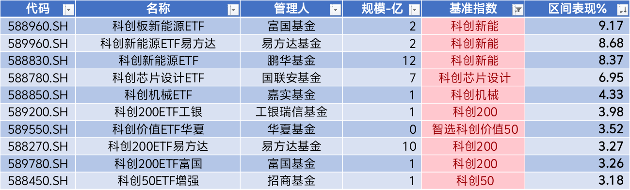 上表是本周市场表现按照降序排列的科创板ETF基金,本文选取前十名。本周科创板ETF中,新能源主题的ETF表现居前。