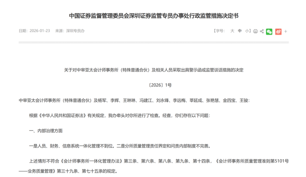 1月23日,深圳证券监管专员办事处发布〔2026〕1号行政监管决定,对中审亚太会计师事务所及相关10名执业人员采取出具警示函或监管谈话措施。