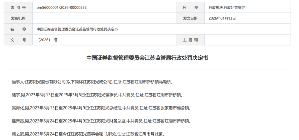 1月13日,江苏监管局发布2026年1号行政处罚决定书,对主板退市公司江苏阳光股份有限公司(下称“江苏阳光”)及相关责任人未依法及时披露重大关联交易后续进展的行为作出处罚。