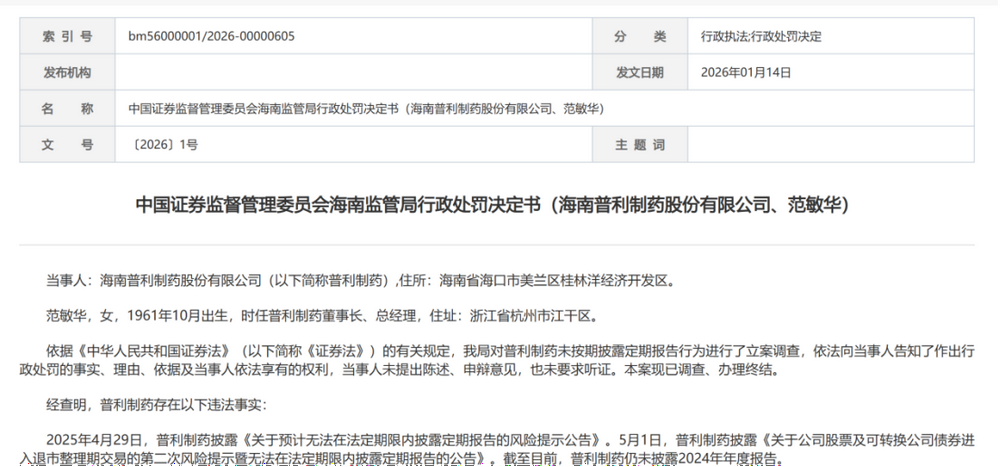1月14日,海南监管局的“1号罚单”显示,创业板退市公司海南普利制药股份有限公司(以下简称“普利制药”)未在法定期限内披露2024年年度报告,时任董事长兼总经理范敏华未能勤勉尽责,对上述违规行为负有直接责任。