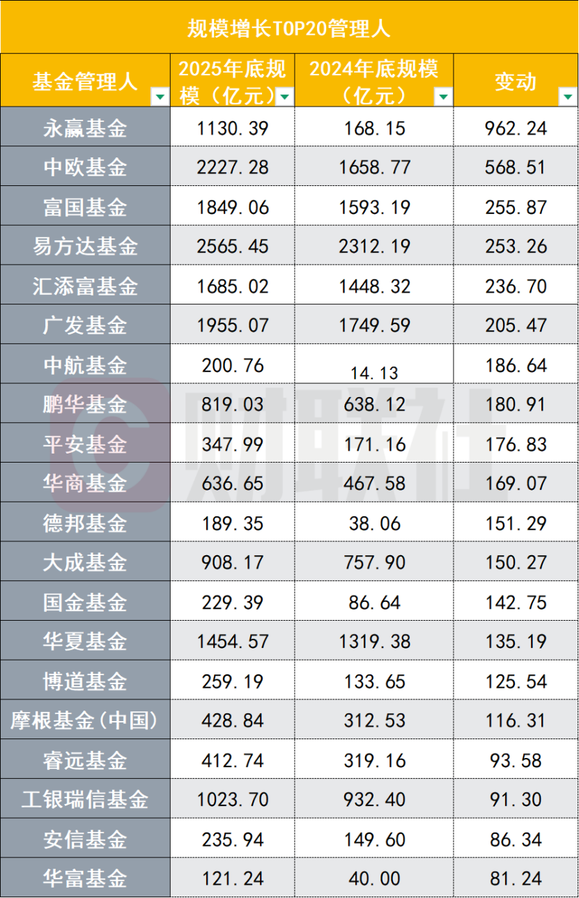另外,华夏基金、景顺长城基金、嘉实基金、兴证全球基金、永赢基金、南方基金、工银瑞信基金等7家基金管理人旗下主动权益基金规模也超过千亿元。其中,永赢基金更是实现了10个位次的跃升,至行业第十,规模增至超900亿元;华夏基金的规模排名也较2024年提升1位,规模增长超百亿。