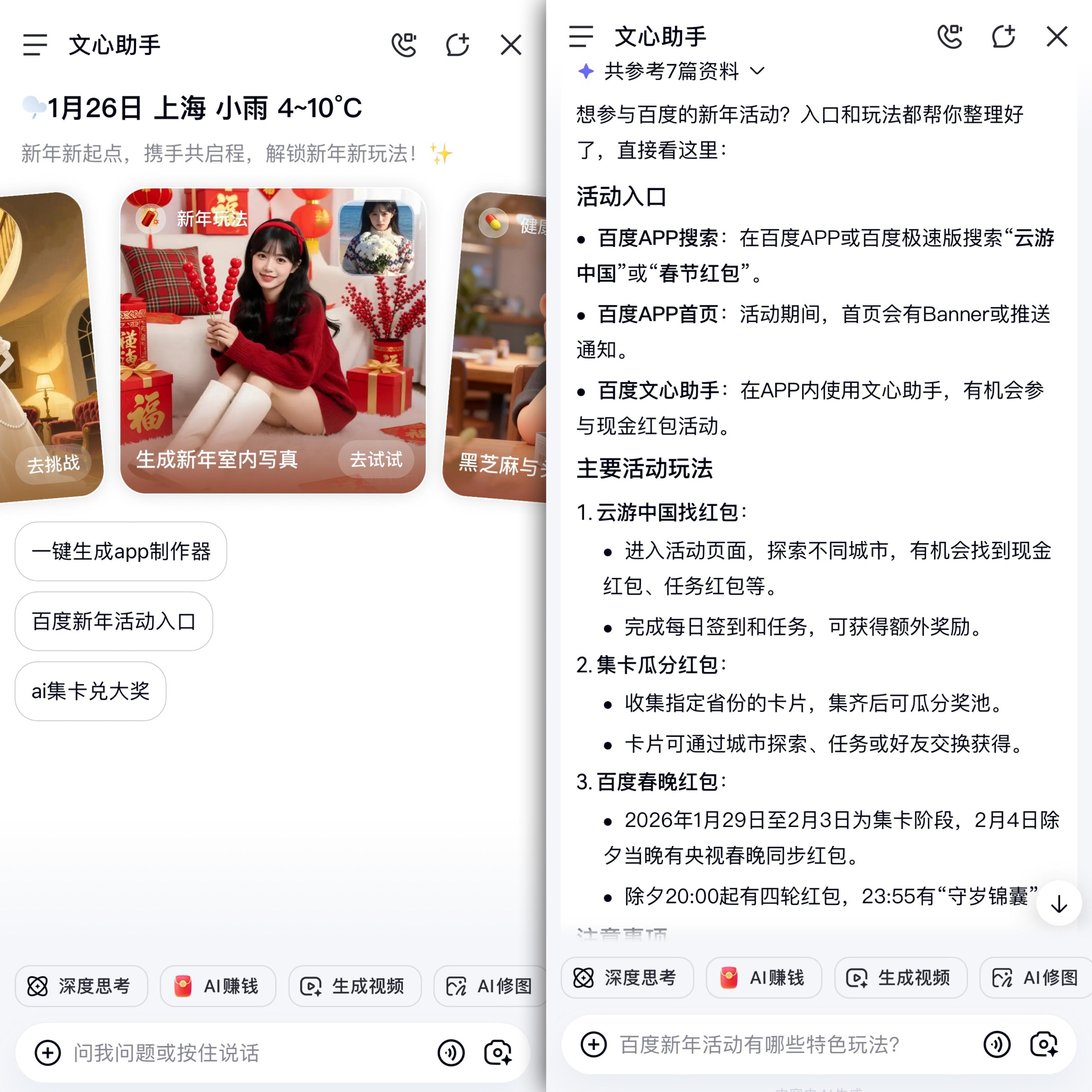 根据文心助手的介绍,此次新年活动包含多种参与方式。用户除通过文心助手参与5亿元红包活动外,还可以在百度APP内搜索“云游中国”或“春节红包”关键词,或通过百度APP首页的Banner广告、系统推送通知等入口获取活动信息并参与。