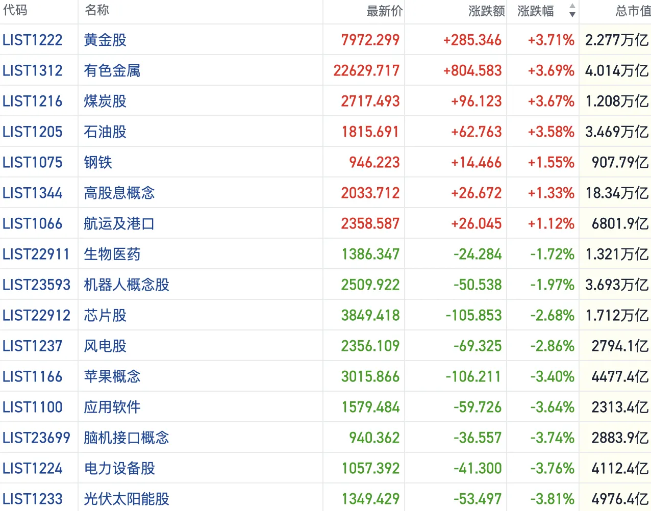 具体来看,黄金、有色等受益大宗商品牛市的行业板块“强者恒强”,而煤炭、石油、航运、公路等高股息资产也获得关注。