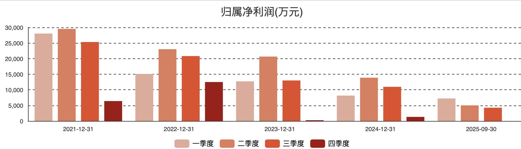 由此计算,该公司2025年第四季度预计实现归母净利润-0.418亿元至-0.258亿元,相较于2025年第三季度4252万元的净利润,环比大幅下滑且由盈转亏。这亦是该公司从2021年以来,首次单季度亏损。