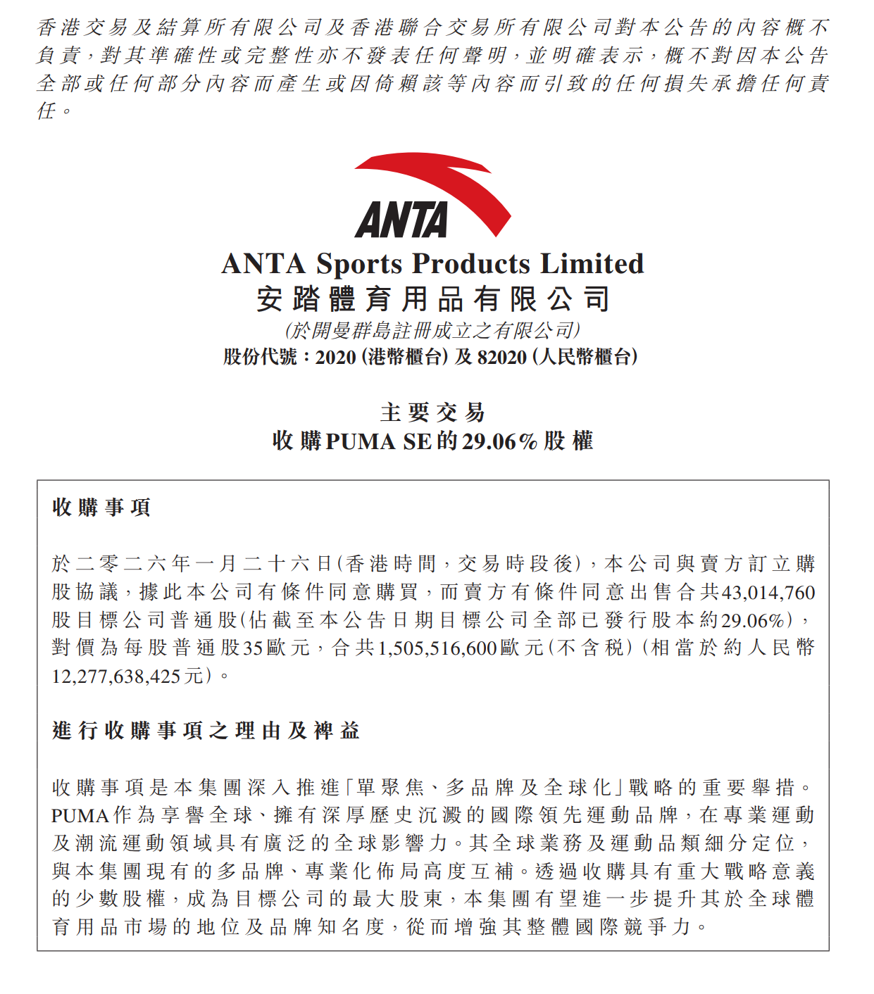 公告称,本次收购后,安踏将成为彪马最大股东。收购举措是安踏深入推进“单聚焦、多品牌及多元化”战略的重要举措。彪马在专业运动及潮流运动领域具有广泛的全球影响力,其全球业务及运动品类细分定位,与安踏现有的多品牌、专业化布局高度互补。