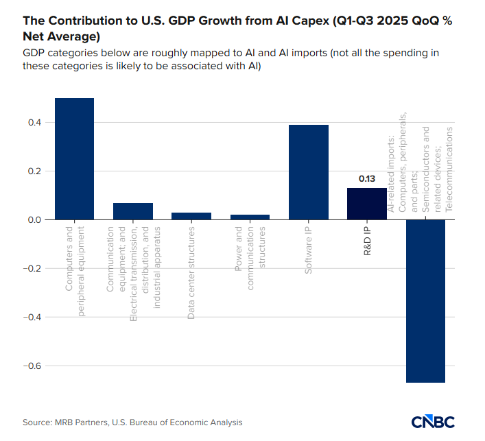 她发现,如果不考虑进口因素,人工智能相关支出似乎在2025年第一季度至第三季度期间平均为实际GDP增长贡献了约90个基点,即0.9%,占同期平均实际GDP增幅的约40%。