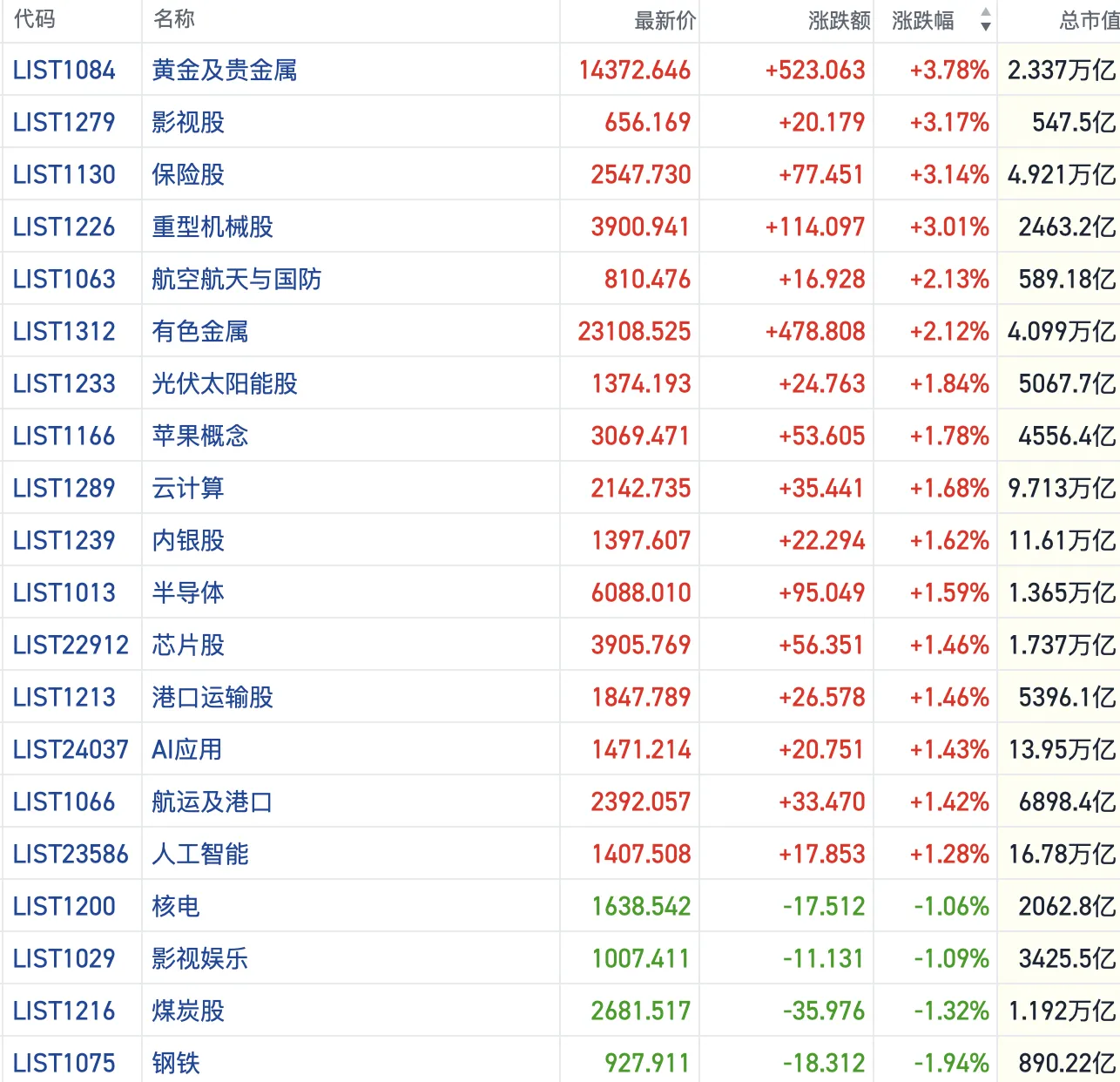 其他方向上,保险、银行等金融股拉升走强助涨大市,中国人寿涨近6%。此外,贵金属、机械、航运等周期股继续活跃。光伏、消费电子、AI应用等板块普涨。