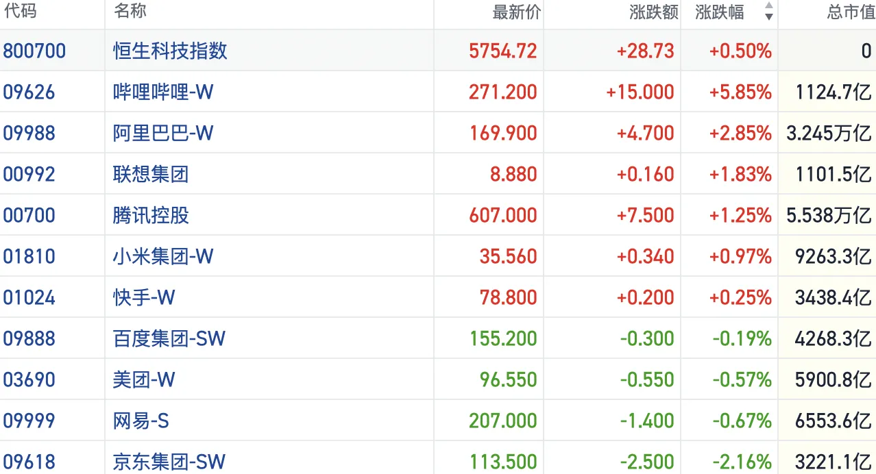 盘面上,今日大型科网股继续分化,阿里巴巴涨近3%,腾讯、小米、快手飘红,京东跌超2%,美团、百度小幅下跌。