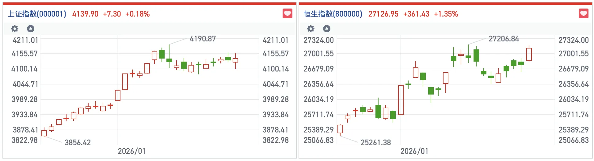 财联社1月27日讯(编辑 冯轶)今日港股再度走强,三大指数集体收涨。截至收盘,恒生指数收涨1.35%重新站上27000点,国企指数涨1.07%,恒生科技指数涨0.5%。