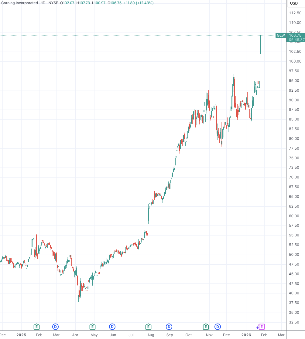 财联社1月27日讯(编辑 史正丞)美股周二开盘后,以向苹果公司供应面板玻璃闻名的康宁(Corning)涨超10%,续创近2000年以来的新高。消息面上,公司与科技巨头Meta签订数据中心光纤电缆供应协议,金额最高可达60亿美元。