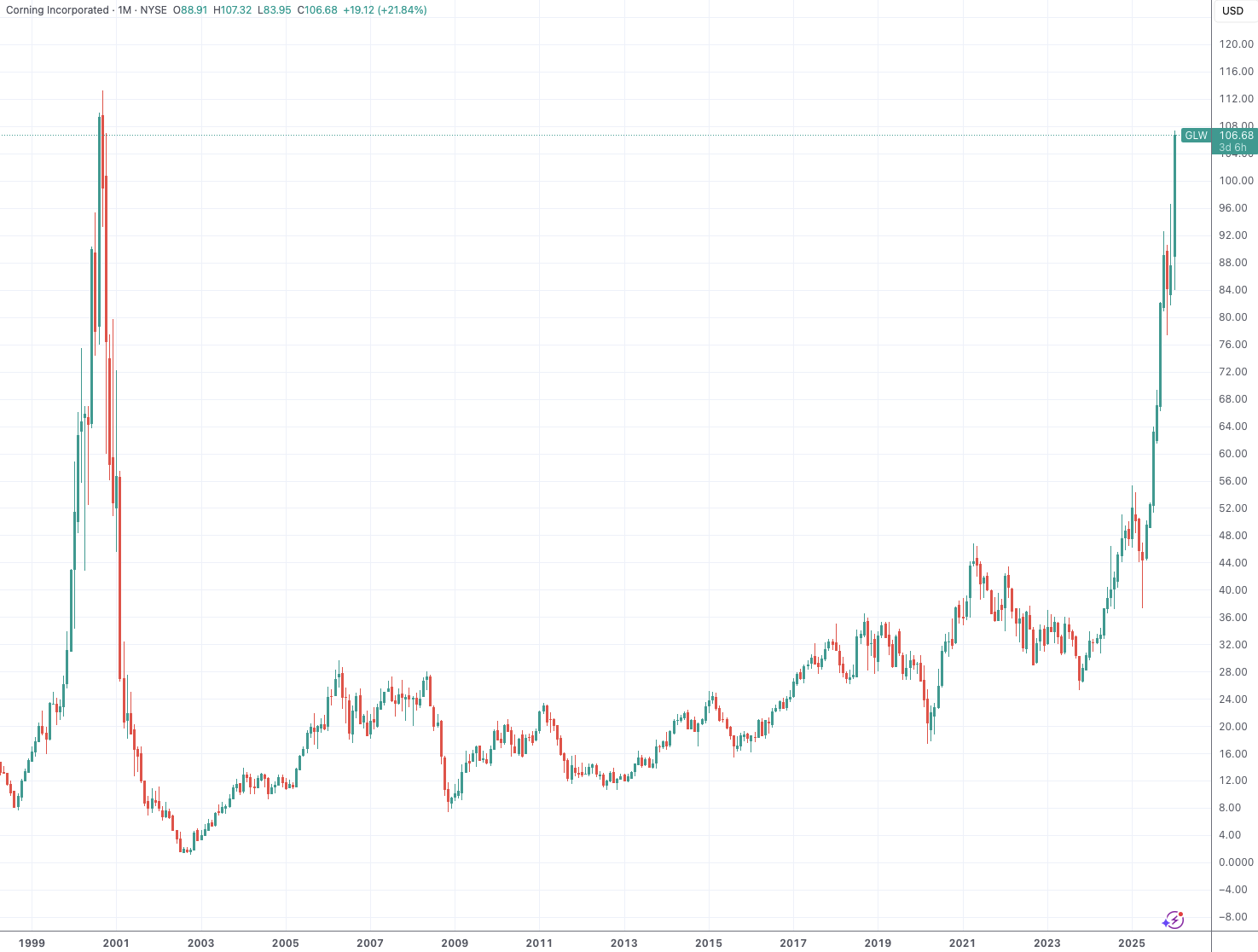 到了90年代互联网热潮期间,基于通信需求暴增的预期,康宁的股价在1997年初至2000年9月大约翻了9倍,随后在市场崩盘中跌掉了90%的市值。正因如此,经历过去一年的翻倍行情后,康宁距离历史新高还差临门一脚。