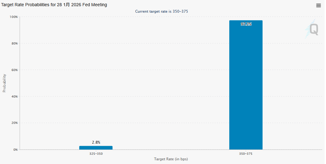 芝商所的美联储观察工具显示,美联储在今晚宣布降息的概率仅为2.8%,而按兵不动的概率则高达97.2%。