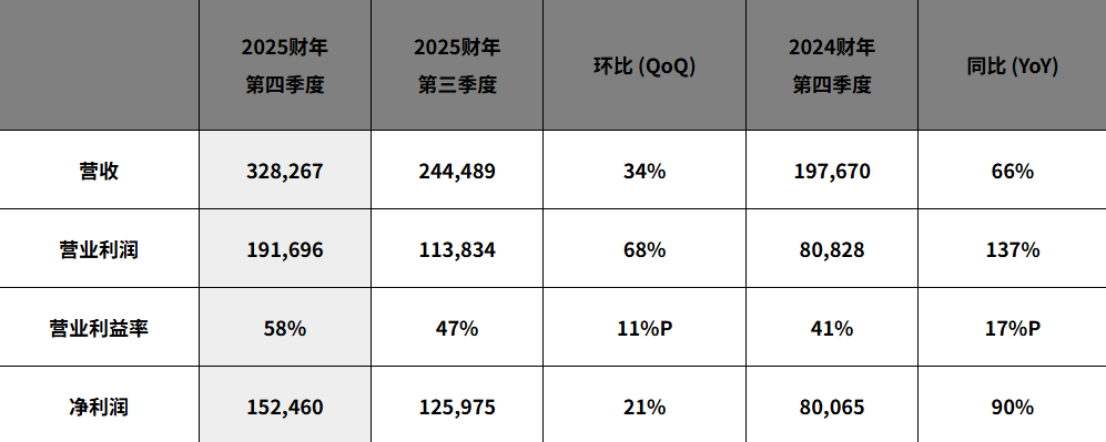 第四季度则展现出业绩加速的增长势头。SK海力士当季营收环比增长34%至32.83万亿韩元,营业利润环比增长68%至19.17万亿韩元。