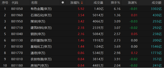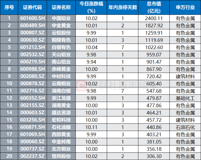 若统计整个资源股(广义),以有色金属、石油石化、煤炭、建筑材料、钢铁、基础化工(申万一级)六大板块统计,其今日涨停股数量占全市场涨停股近六成比例。具体个股来看,中国铝业、中金黄金、云铝股份、铜陵有色、白银有色5只千亿市值股在列,其中,中国铝业、中金黄金今日成交额创上市以来新高,铜陵有色、白银有色均于昨日录得历史天量。